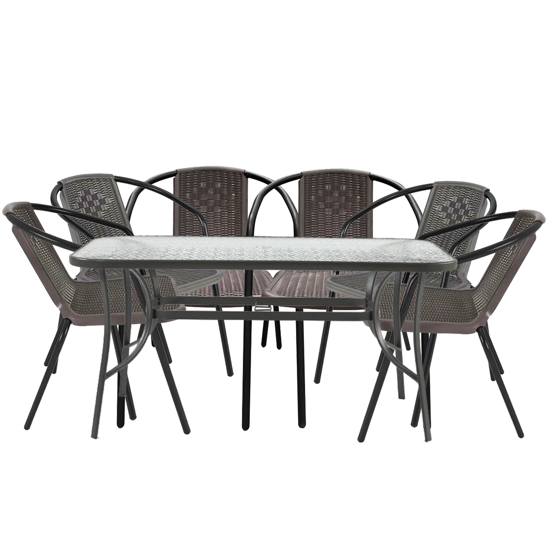 წრთობი მინის მაგიდისა და მოწნული იმიტაციის,პლასტმასის სკამების კომპლექტი მეტალის კარკასით თქვენს ინტერიერსა თუ ექსტერიერს შესძენს მყუდროებას და გამორჩეულ დიზაინს.