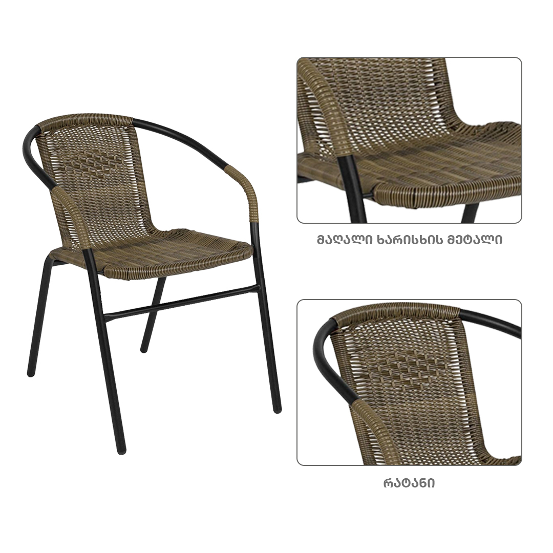 ნაწრთობი მინის მაგიდისა და მოწნული სკამების კომპლექტი მეტალის კარკასით თქვენს ინტერიერსა თუ ექსტერიერს შესძენს მყუდროებას და გამორჩეულ დიზაინს.