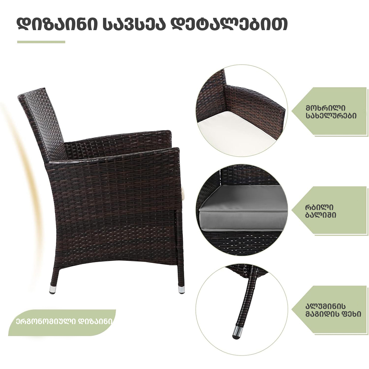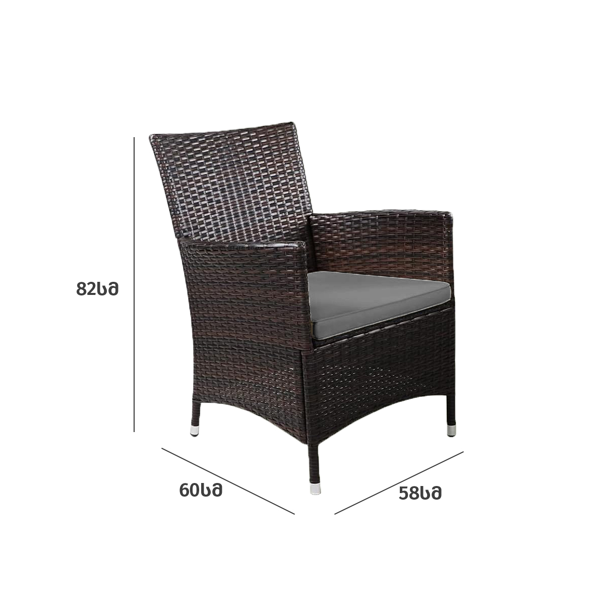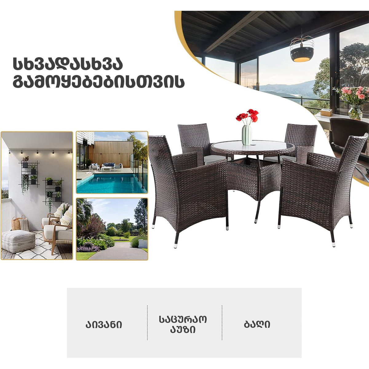 გარე ავეჯის კომპლექტი – 4 ნაწილიანი მოიწყვეთ ეზო, აივანი ან ტერასა კომფორტულად და ლამაზას ამ ელეგანტური 4-ნაწილიანი გარე ავეჯის კომპლექტით. კომპლექტში შედის ოთხი სავარძელი და მინის ზედაპირიანი მაგიდა. დამზადებულია გამძლე რტანის მასალისგან, რაც უზრუნველყოფს ხანგრძლივობასა და ამინდის მიმართ მდგრადობას. რბილი ბალიშები კი მაქსიმალურ კომფორტს. მახასიათებლები: გამძლე რტანის სტრუქტურა კომფორტული, მოსახსნელი ბალიშები მარტივი დასადგმელი და მოსავლელი იდეალურია ეზოსთვის, აივნისთვის ან ბაღისთვის
