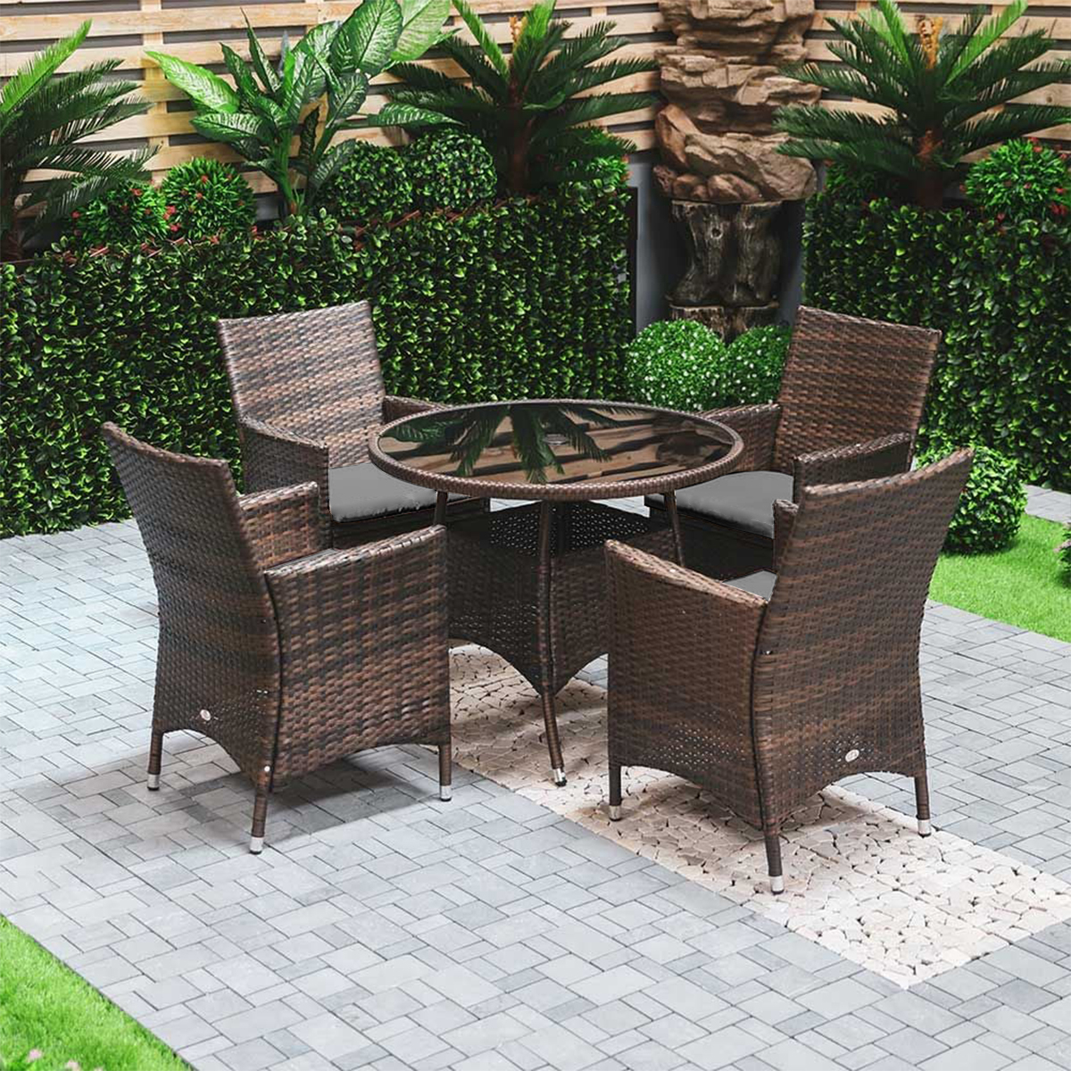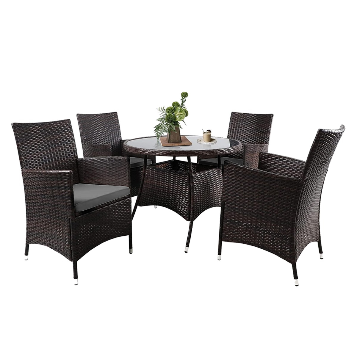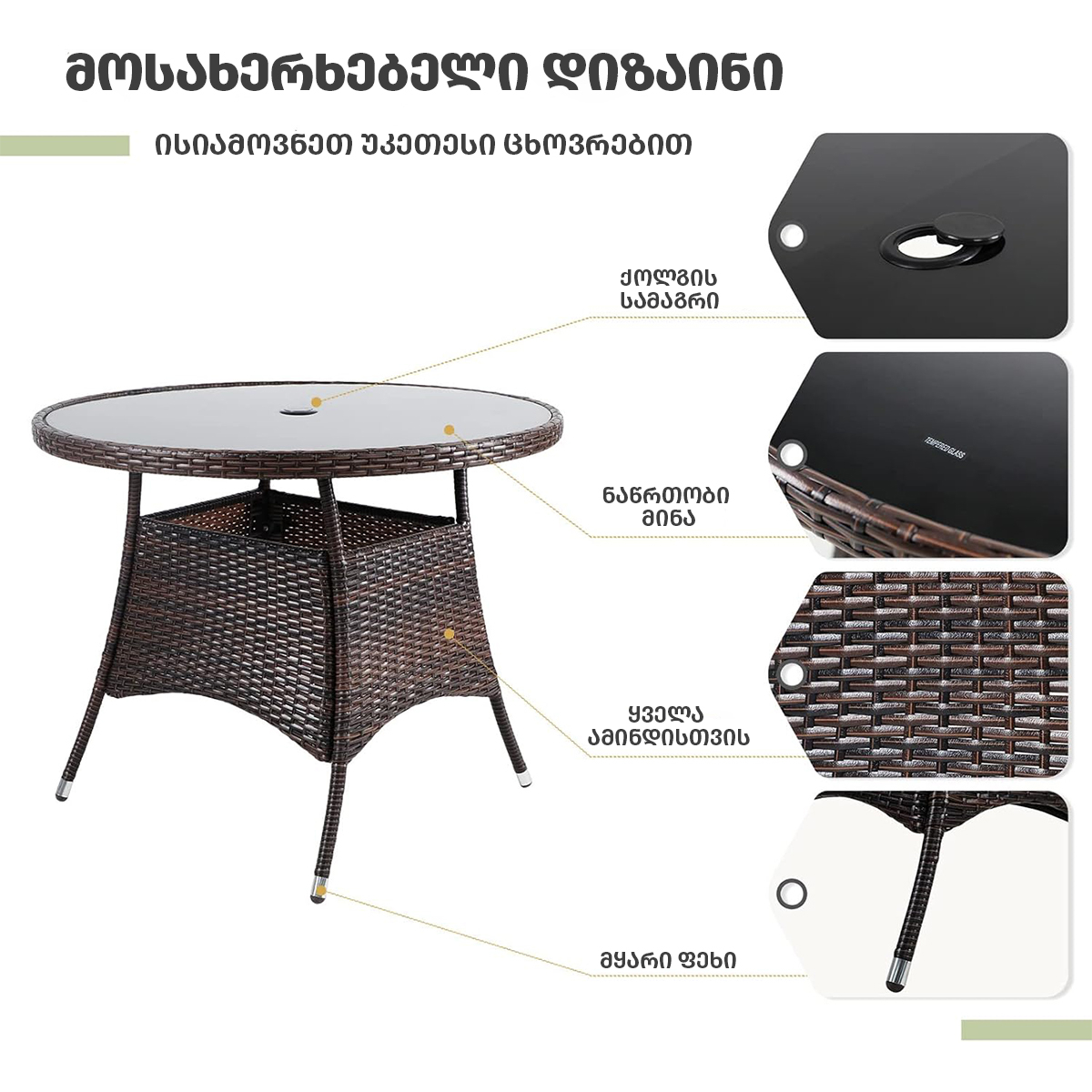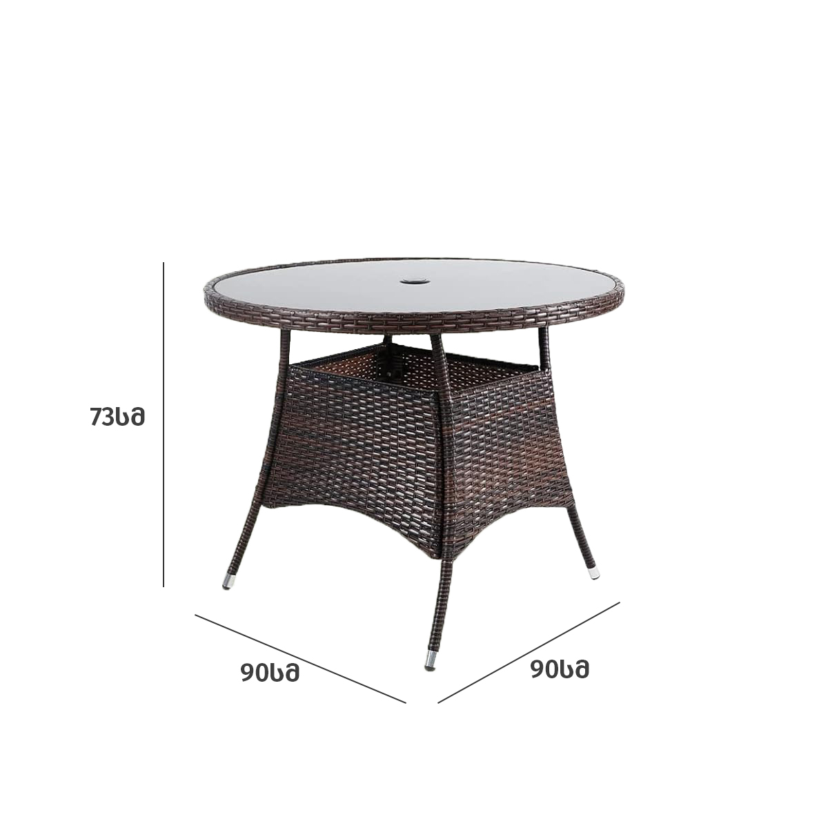 გარე ავეჯის კომპლექტი – 4 ნაწილიანი მოიწყვეთ ეზო, აივანი ან ტერასა კომფორტულად და ლამაზას ამ ელეგანტური 4-ნაწილიანი გარე ავეჯის კომპლექტით. კომპლექტში შედის ოთხი სავარძელი და მინის ზედაპირიანი მაგიდა. დამზადებულია გამძლე რტანის მასალისგან, რაც უზრუნველყოფს ხანგრძლივობასა და ამინდის მიმართ მდგრადობას. რბილი ბალიშები კი მაქსიმალურ კომფორტს. მახასიათებლები: გამძლე რტანის სტრუქტურა კომფორტული, მოსახსნელი ბალიშები მარტივი დასადგმელი და მოსავლელი იდეალურია ეზოსთვის, აივნისთვის ან ბაღისთვის