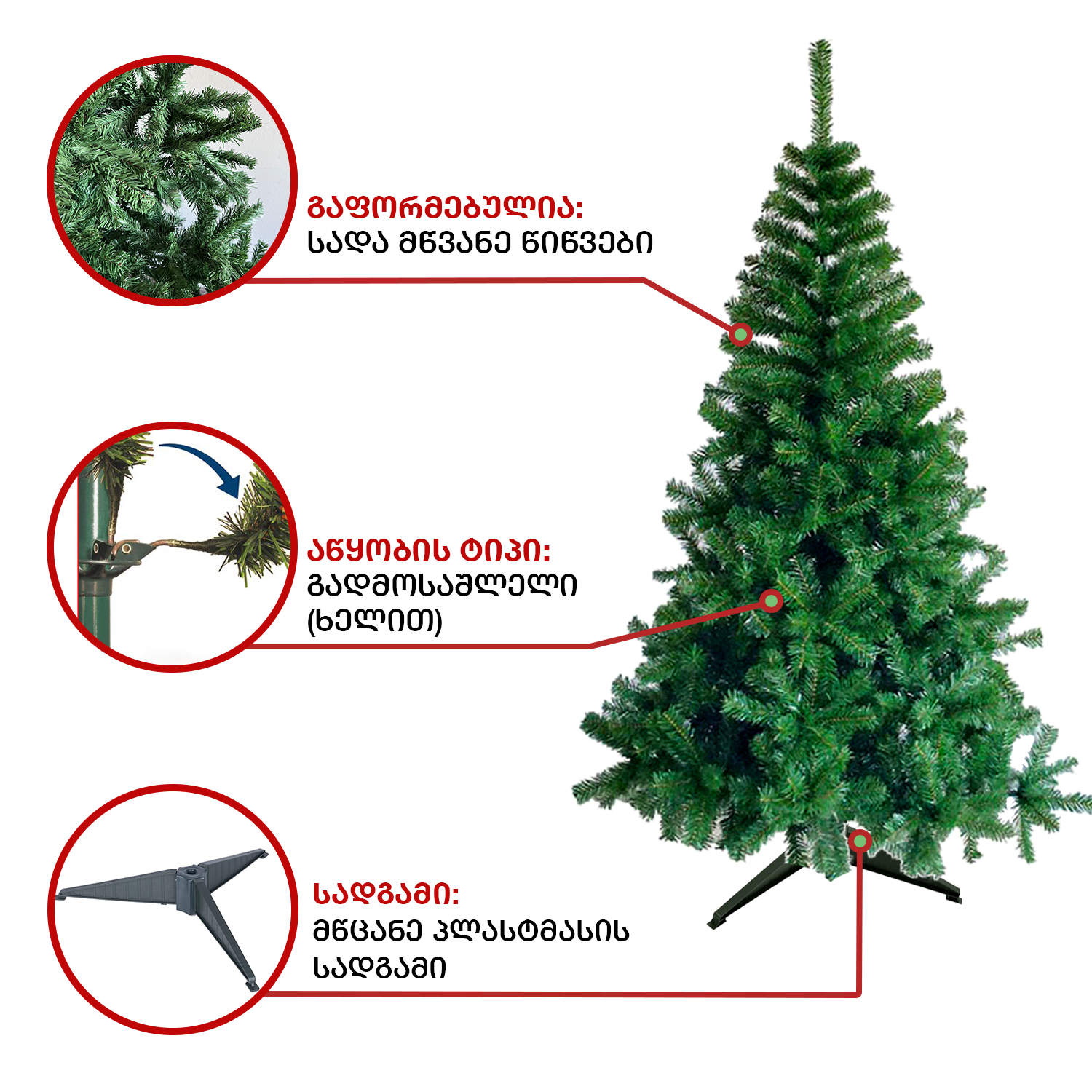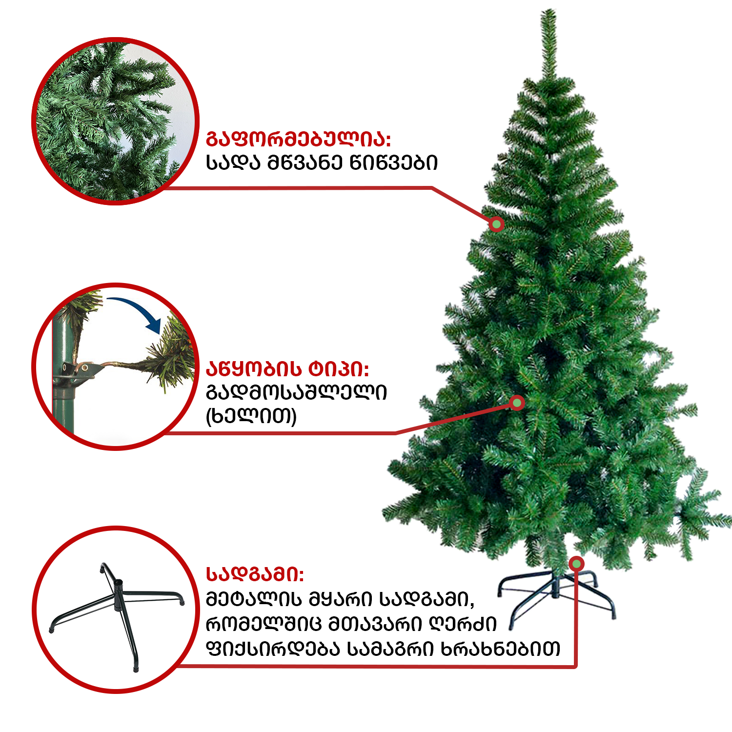 ნაძვის ხე გამძლე დრეკადი მეტალის ტოტებით და ჯანმრთელობისთვის უსაფრთხო მასალისგან დამზადებული წიწვებით. მეტალის მყარი სადგამით და მთავარი ღერძით.