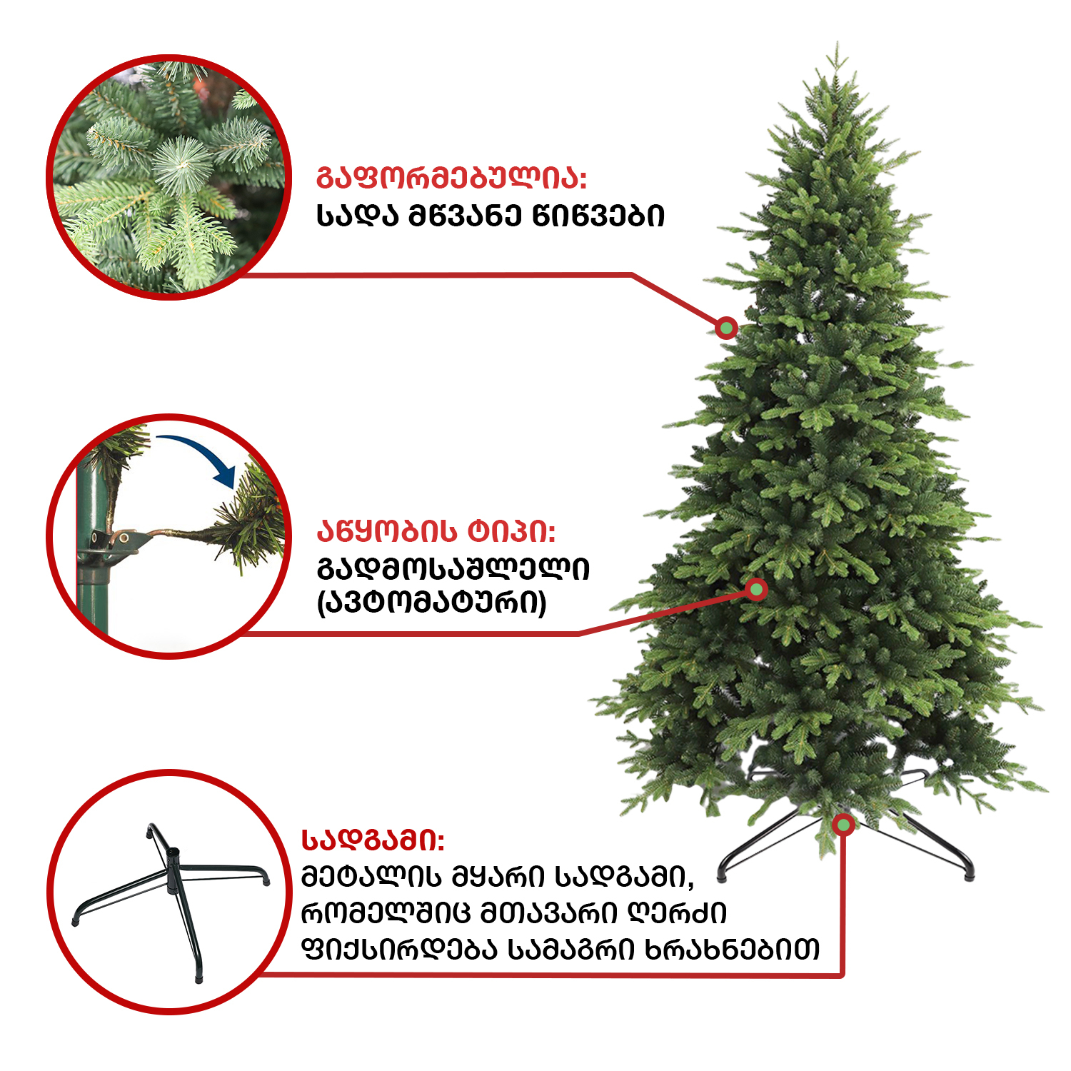 ბუნებრივის მსგავსი ნაძვის ხე, დრეკადი მეტალის ტოტებით და ჯანმრთელობისთვის უსაფრთხო მასალისგან დამზადებული შერეული ორი ფერის, სილიკონის და PVC წიწვით . მეტალის მყარი სადგამით და მთავარი ღერძით.