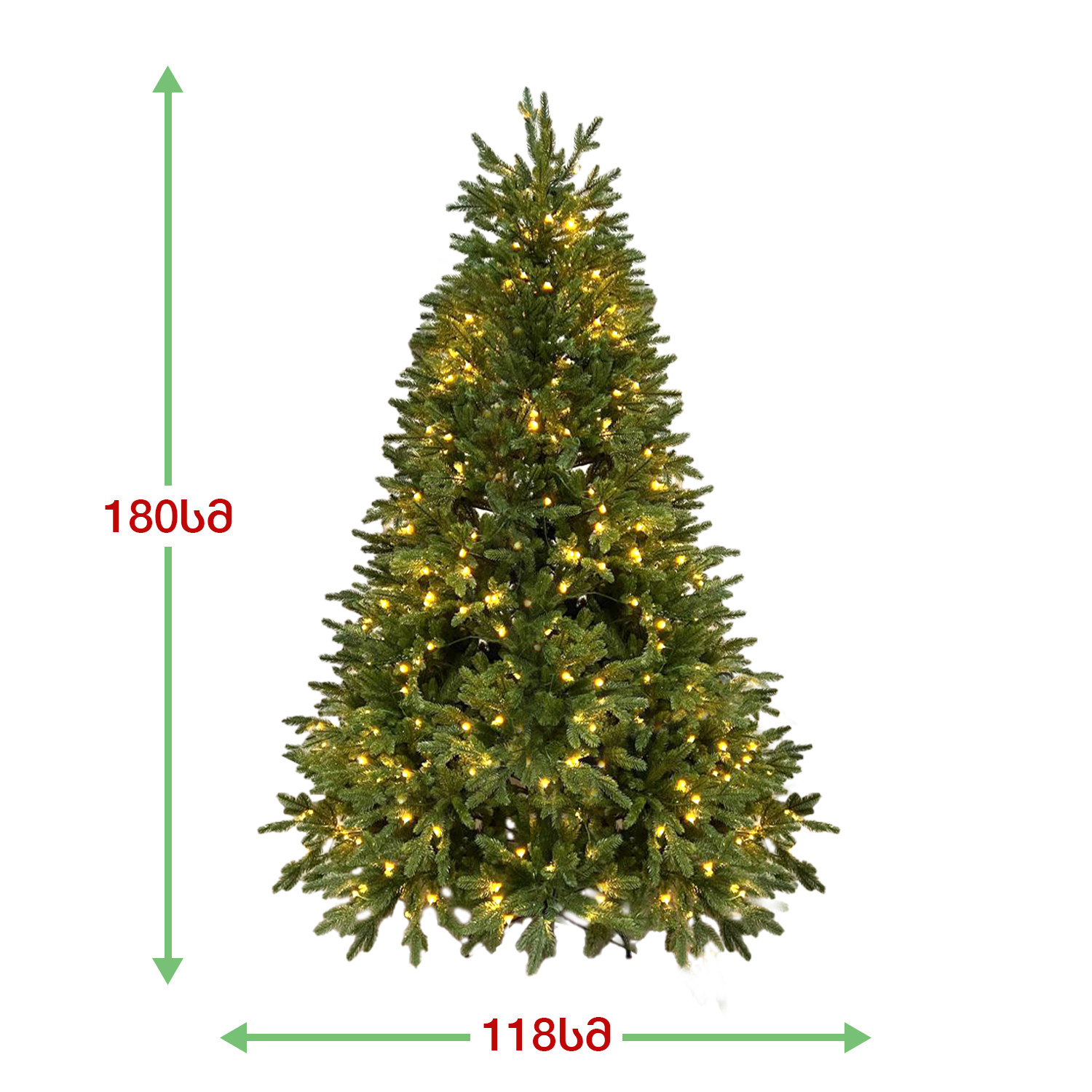 ბუნებრივის მსგავსი მწვანე ნაძვის ხე, ინტეგრირებული LED ნათურებით, დამზადებული 100% სილიკონის წიწვებით. გამძლე დრეკადი მეტალის ტოტებით და ჯანმრთელობისთვის უსაფრთხო მასალისგან დამზადებული წიწვებით. მეტალის მყარი სადგამით და მთავარი ღერძით.
