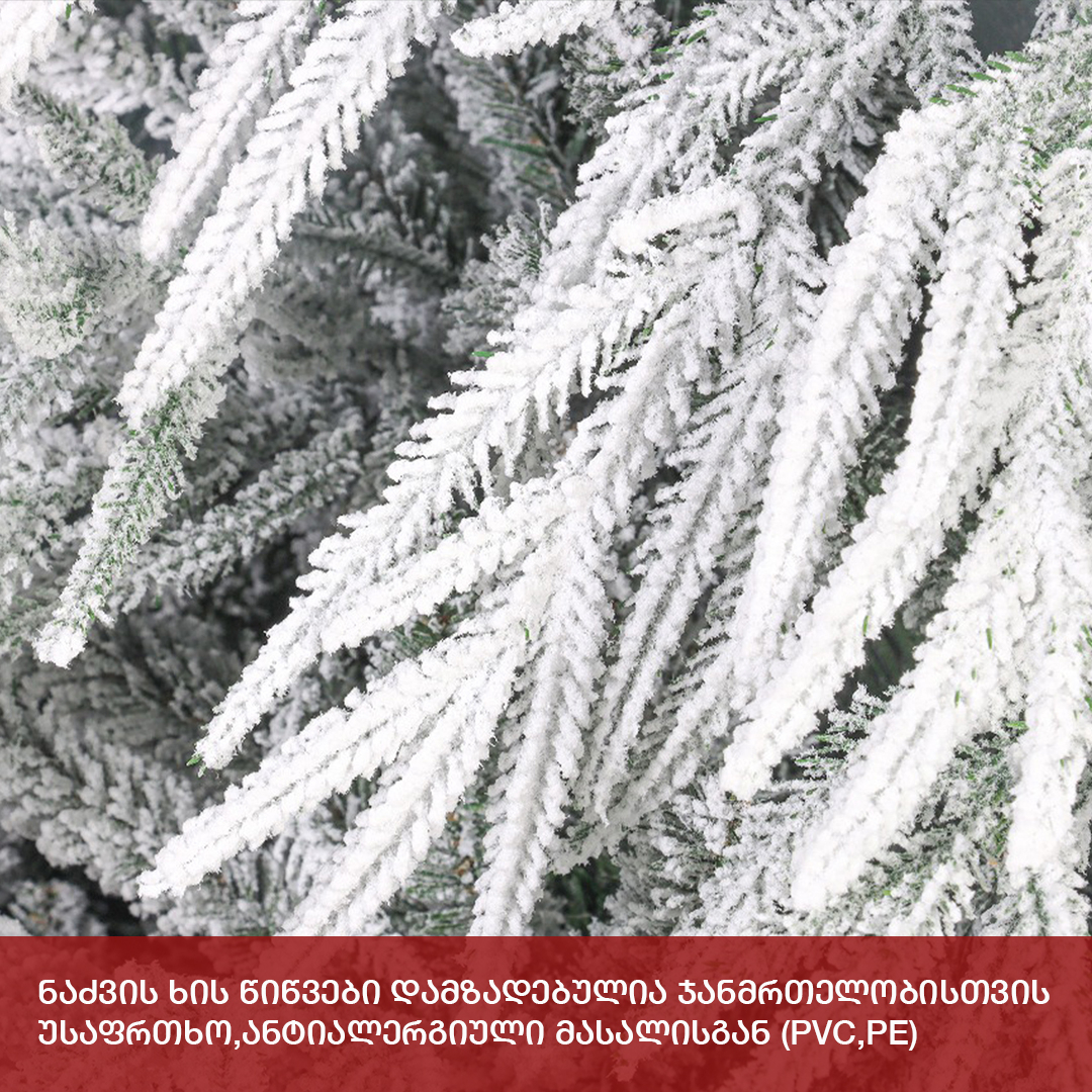 ბუნებრივის მსგავსი დათოვლილი ნაძვის ხე,  დრეკადი მეტალის ტოტებით და ჯანმრთელობისთვის უსაფრთხო მასალისგან დამზადებული შერეული ორი სახეობის სილიკონის და PVC წიწვით . მეტალის მყარი სადგამით და მთავარი ღერძით.