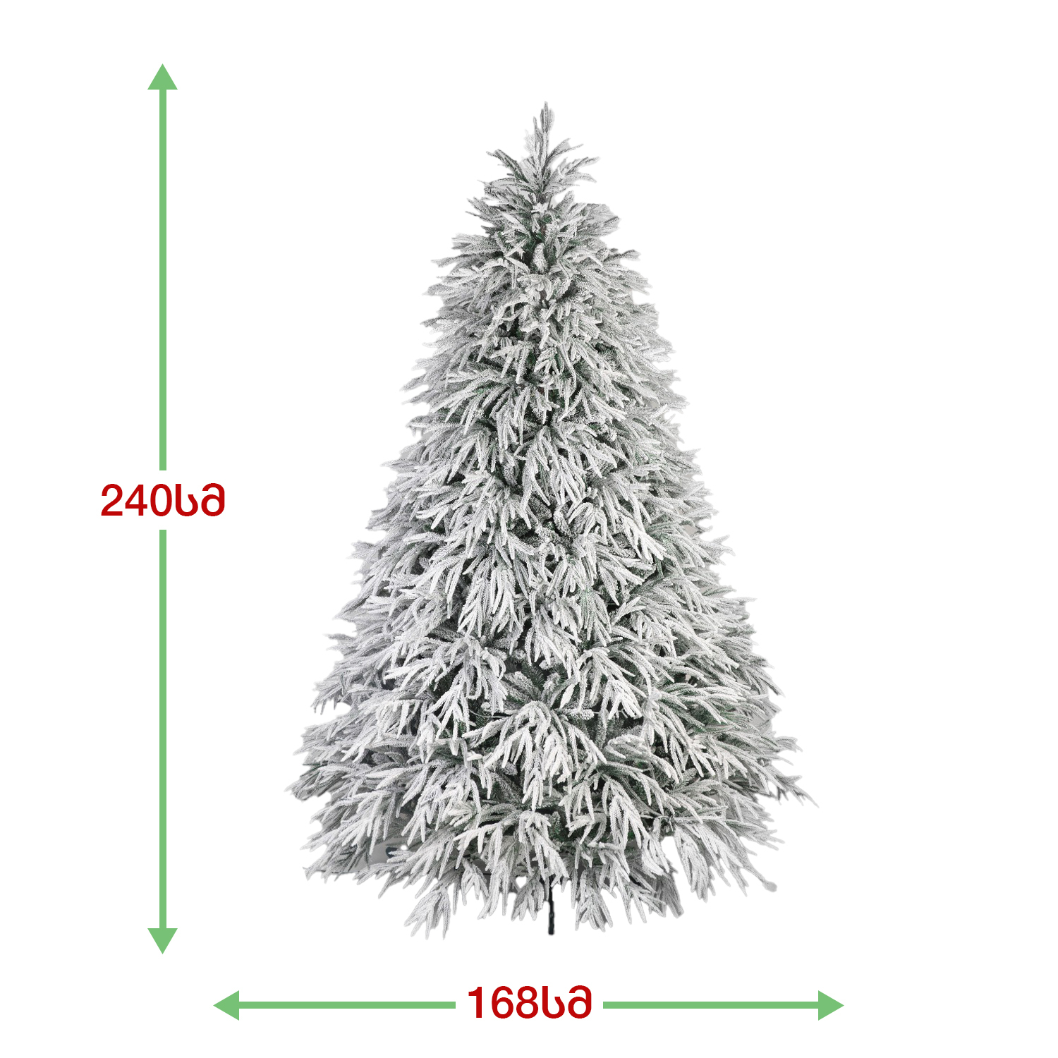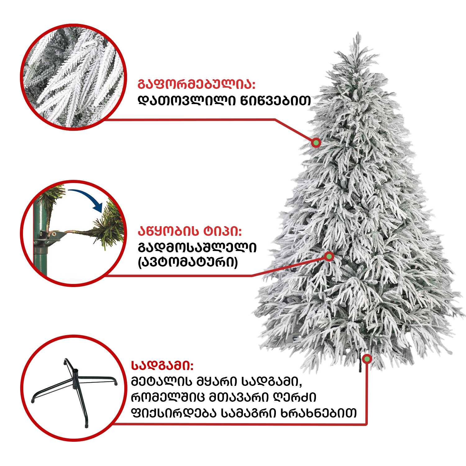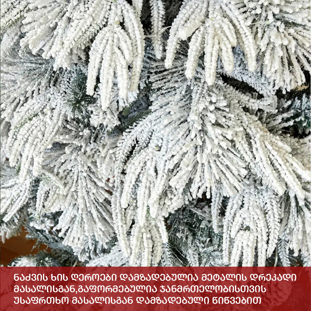 ბუნებრივის მსგავსი დათოვლილი ნაძვის ხე, დრეკადი მეტალის ტოტებით და ჯანმრთელობისთვის უსაფრთხო მასალისგან დამზადებული შერეული ორი სახეობის სილიკონის და PVC წიწვით . მეტალის მყარი სადგამით და მთავარი ღერძით.