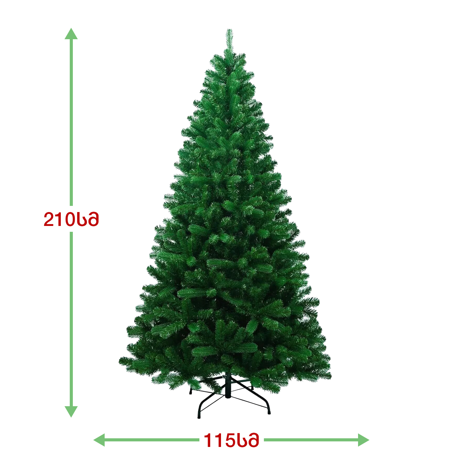 სადა მწვანე ნაძვის ხე გამძლე დრეკადი მეტალის ტოტებით და ჯანმრთელობისთვის უსაფრთხო მასალისგან დამზადებული წიწვებით. მეტალის მყარი სადგამით და მთავარი ღერძით.