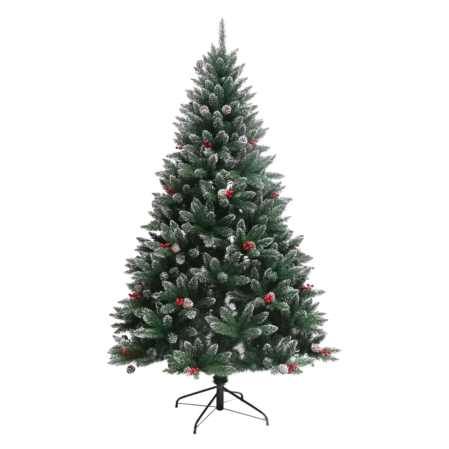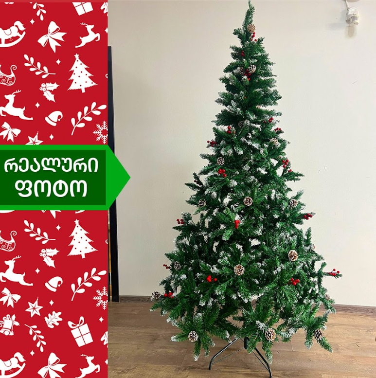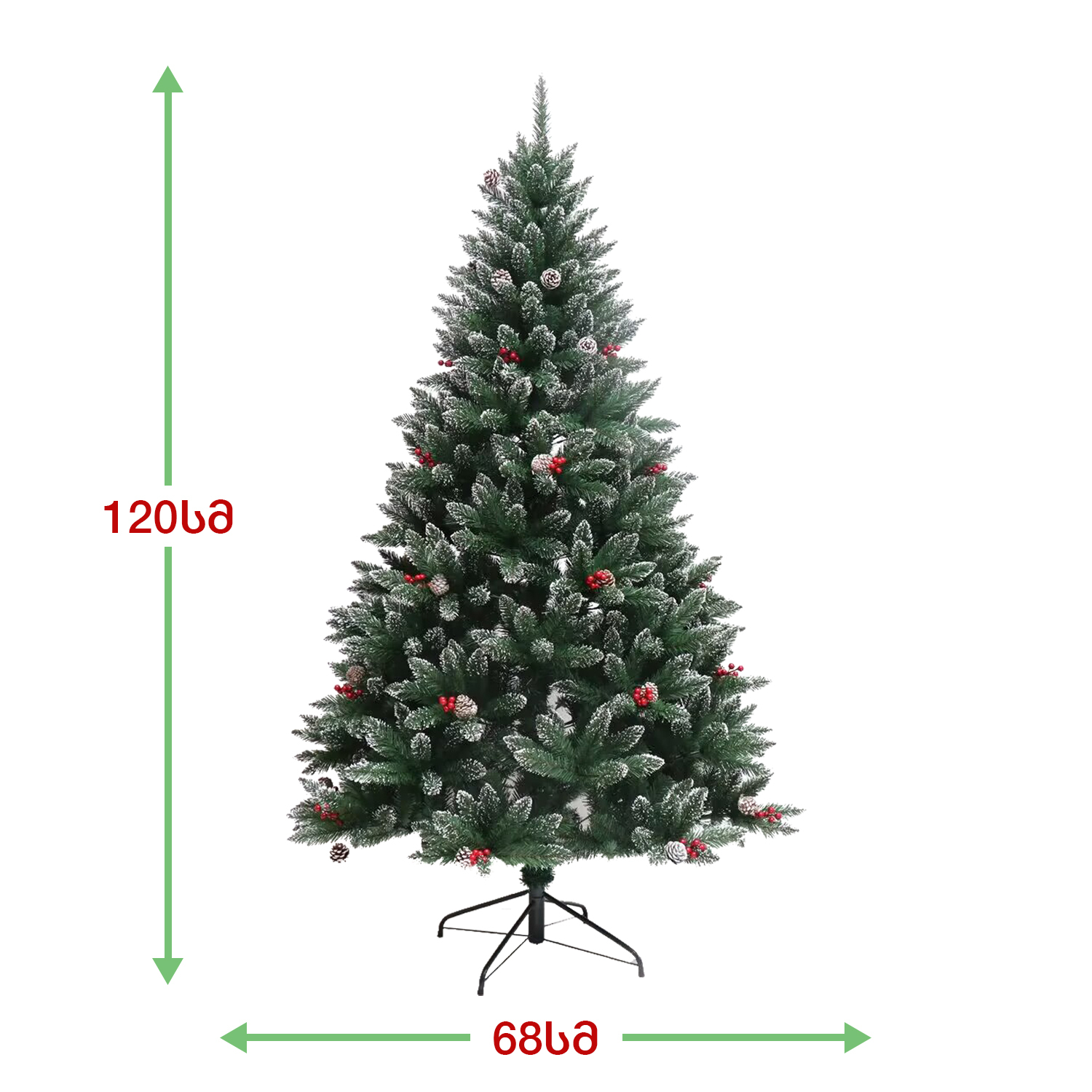 ნაძვის ხე დათოვლილი ბოლოებით, გაფორმებული გირჩებით და კენკრით. გამძლე დრეკადი მეტალის ტოტებით და ჯანმრთელობისთვის უსაფრთხო მასალისგან დამზადებული წიწვებით. მეტალის მყარი სადგამით და მთავარი ღერძით.