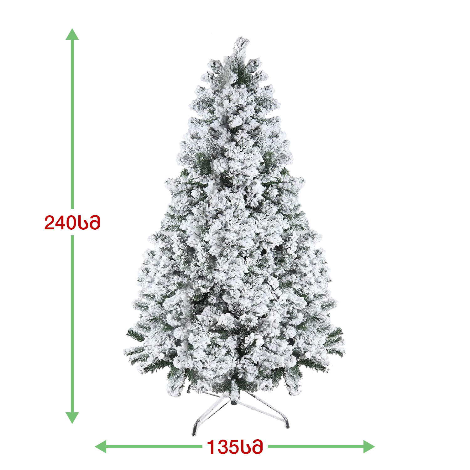 დათოვლილი ნაძვის ხე გამძლე დრეკადი მეტალის ტოტებით და ჯანმრთელობისთვის უსაფრთხო მასალისგან დამზადებული წიწვებით. მეტალის მყარი სადგამით და მთავარი ღერძით.