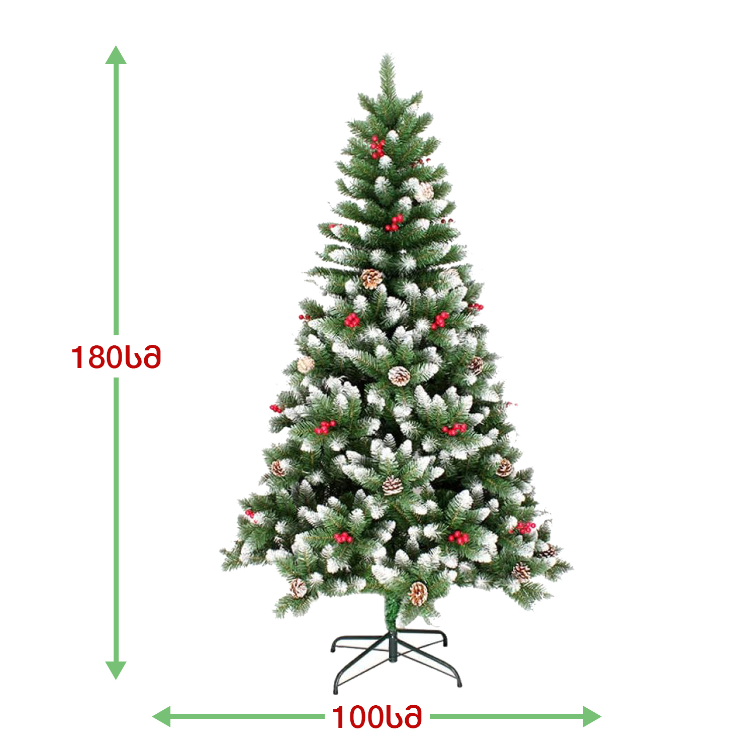 ნაძვის ხე დათოვლილი ბოლოებით, გაფორმებული გირჩებით და კენკრით. გამძლე დრეკადი მეტალის ტოტებით და ჯანმრთელობისთვის უსაფრთხო მასალისგან დამზადებული წიწვებით. მეტალის მყარი სადგამით და მთავარი ღერძით.