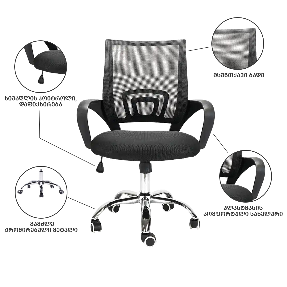 მსუნთქავი ბადისებრი საზურგე: ვენტილირებული ბადის საზურგე უზრუნველყოფს ჰაერის ცირკულაციას, ხანგრძლივი სამუშაო დღის განმავლობაში.