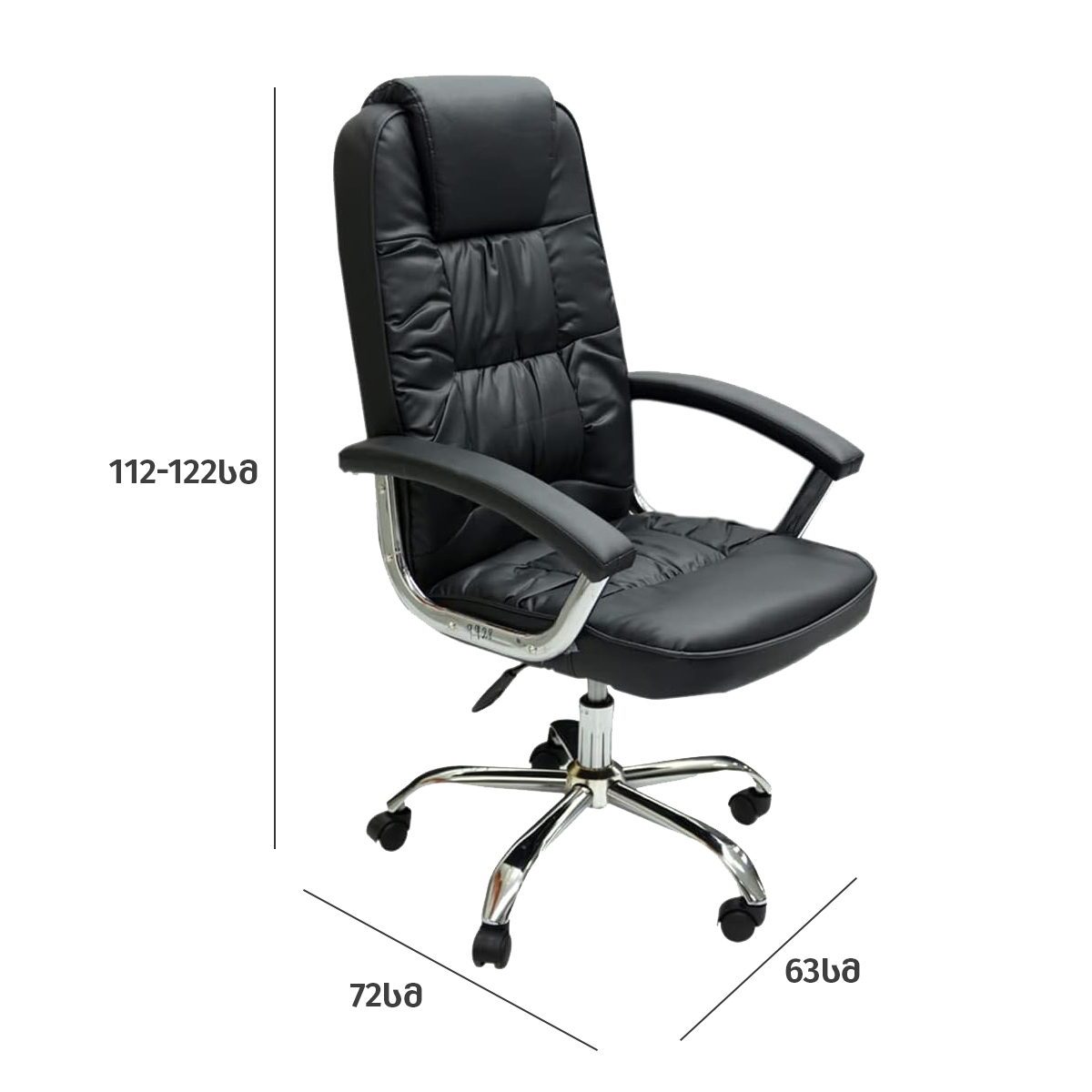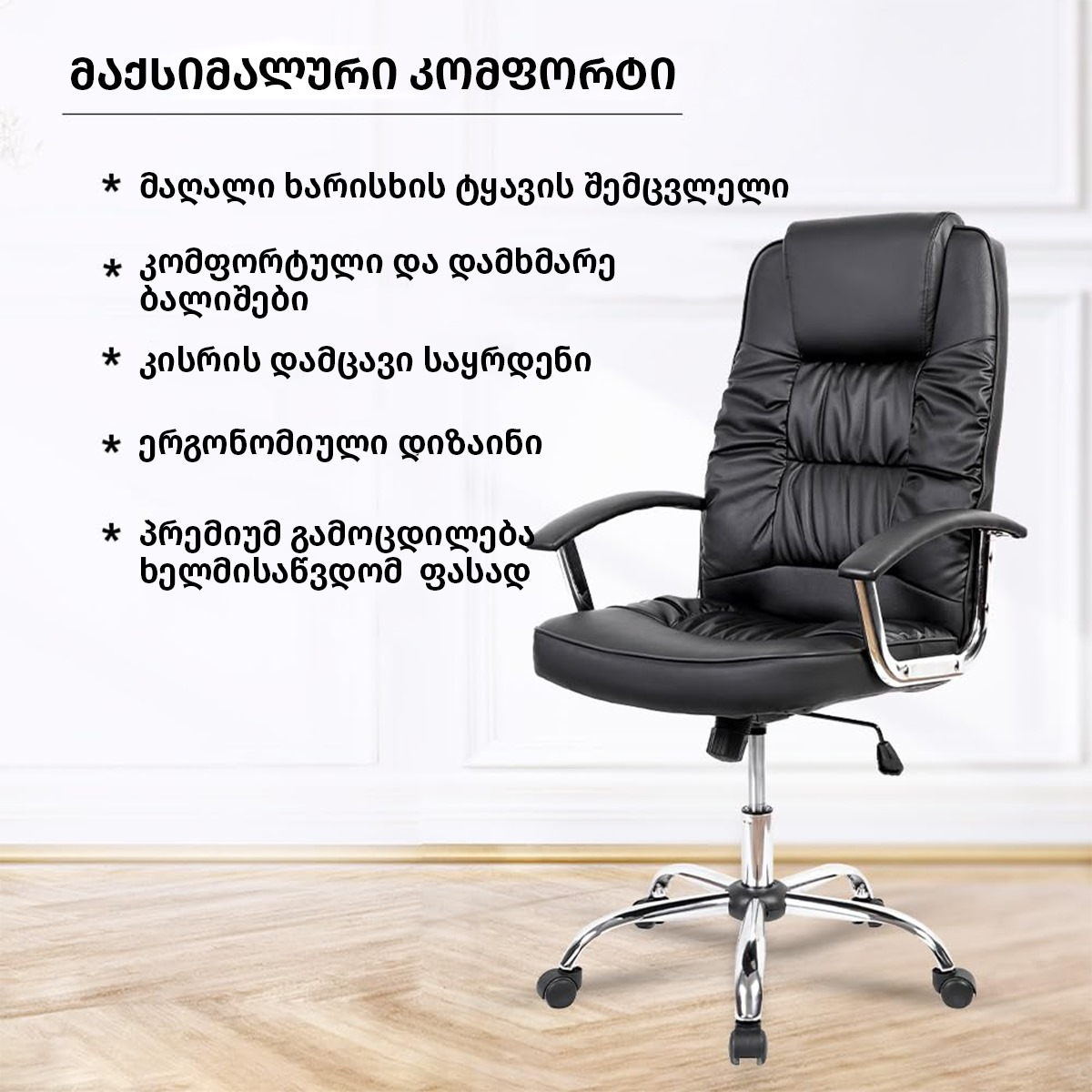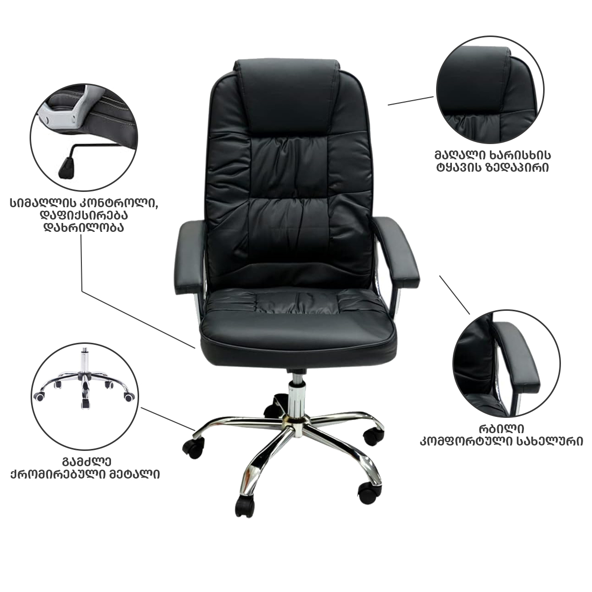 გაუმჯობესეთ თქვენი სამუშაო სივრცე მაქსიმალური კომფორტით და ელეგანტურობით ჩვენი ერგონომიული მაღალი ხარისხის საოფისე სკამით. სკამი დამზადებულია უმაღლესი ხარისხის მასალებისგან და უზრუნველყოფს თქვენს კომფორტულ და სწორ პოზიციაში მუშაობას, რაც დაგეხმარებათ მთელი დღის განმავლობაში რომ არ დაგეღალოთ კისერი და ზურგი. მთავარი მახასიათებლები: ერგონომიული დიზაინი: მაღალი საზურგე ხელს უწყობს სწორ პოზიციაში ჯდობას და ამცირებს ზურგის ტკივილის რისკს. პრემიუმ ხარისხის მასალა: დამზადებულია მაღალი ხარისხის, მდგრადი ხელოვნური ტყავით, რაც უზრუნველყოფს ელეგანტურ და პროფესიონალურ იერსახეს და მარტივად იწმინდება და ინარჩუნებს სისუფთავეს. კომფორტული ბალიშები: უხვად შევსებული სავარძელი და ზურგის ბალიში უზრუნველყოფს განსაკუთრებულ კომფორტს, რაც ხელს უწყობს თქვენი კონცენტრაციისა და პროდუქტიულობის შენარჩუნებას მთელი დღის განმავლობაში. მოწესრიგებული სიმაღლე: პნევმატური სავარძლის სიმაღლის რეგულირების ფუნქცია საშუალებას გაძლევთ მოირგოთ სკამი თქვენს სასურველ სიმაღლეზე, რაც უზრუნველყოფს იდეალურ მიდგომას ნებისმიერ მაგიდასთან. მარტივი მობილურობა: აღჭურვილია მტკიცე ქრომირებული ბაზით და გლუვი მოძრავი ბორბლებით, რაც უზრუნველყოფს ადვილ მანევრირებას თქვენს სამუშაო სივრცეში. სტილური სახელურები: ბალიშებიანი სახელურები ქრომის აქცენტებით ამატებს ელეგანტურობას და უზრუნველყოფს დამატებით მხარდაჭერას თქვენი ხელებისა და მხრებისათვის.